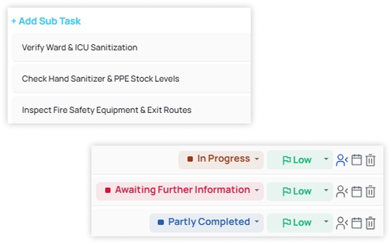 - Subtasks auto-assign to departments (lab, pharmacy, billing)